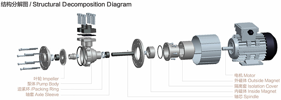 磁力驅動式高溫泵采用先進設計原理與制造工藝,通過外磁體、隔離套、內磁體之間的磁場傳導,將動密封轉換為靜密封,保證泵浦高溫狀態下的穩定性工作。廣泛配套小型精密高溫模溫機、試驗儀器、高低溫檢測、超聲波清洗等行業,泵浦移送循環介質不含顆粒、纖維、非易燃易爆的液體。